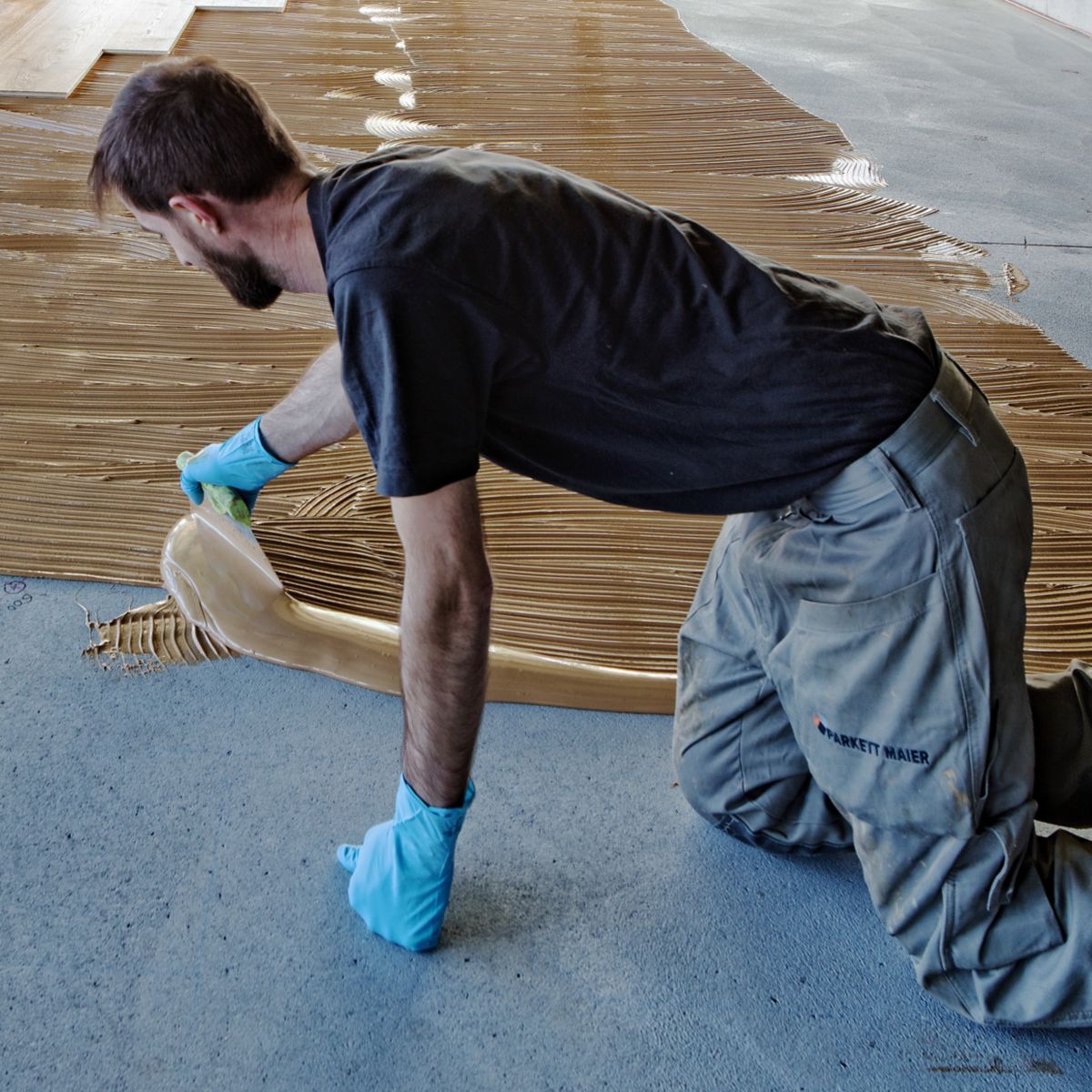 Since the parquet is on a paper backing, you can now use a wallpaper mucilage to apply to the floor.